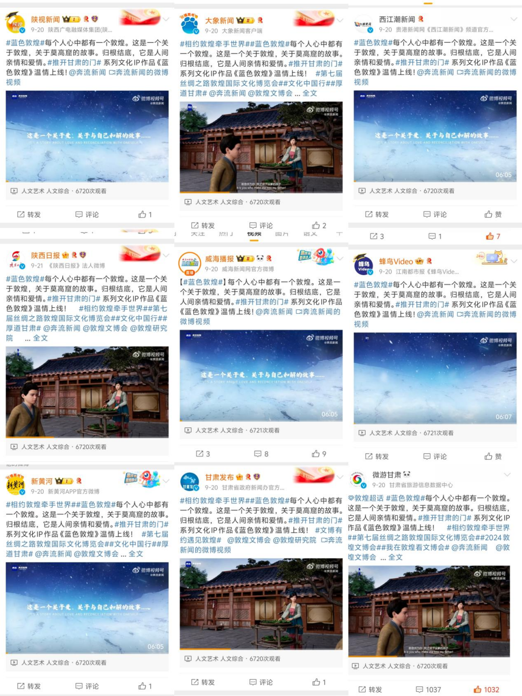 短短四天,全网累计阅读量达1000万。其中奔流新闻客户端阅读量190万+;奔流新闻微博开设话题#蓝色敦煌#累计阅读量290万+,播放当天就冲上微博同城热榜第二位,随后登上总榜前列;奔流新闻视频号发布的《蓝色敦煌》及四条切片视频累计阅读量107万,并得到新甘肃、每日甘肃网、甘肃法治报、甘肃发布、甘肃省博物馆、甘肃省图书馆等甘肃媒体与机构账号,以及人民日报客户端新媒体聚合平台“人民号”、大象新闻、新黄河、重庆第1眼、陕西日报等国内主流媒体支持转发,累计传播量达到360万+。