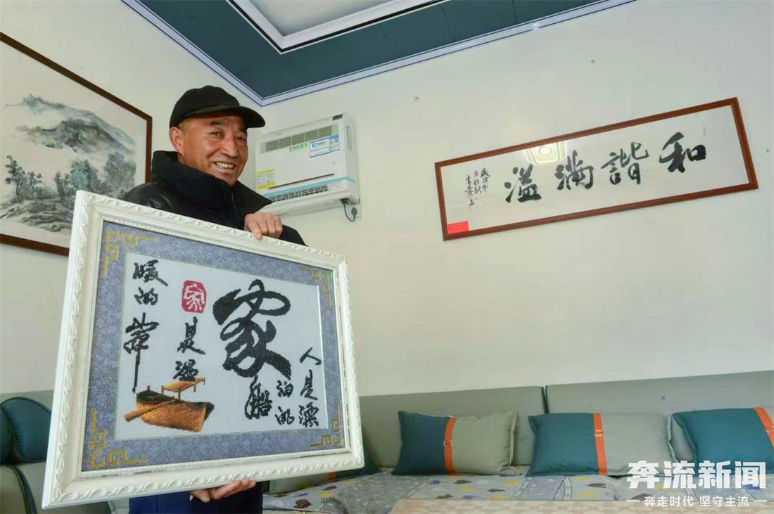 杨成林是村里的能干人,瓦工、木工都拿手,他和儿子务工养家。老伴做得一手好针线活,10月份搬进新居前,特意绣了许多十字绣,其中一幅放在新家的沙发靠背上,内容是从网上看的,充满诗意:“人是漂泊的船,家是温暖的岸。”中间是一个大大的“家”。