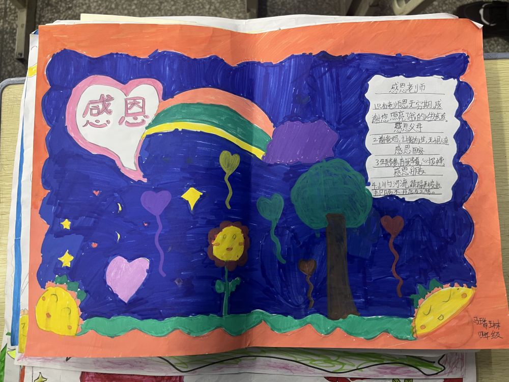 橘红色边框,蓝紫色背景,缤纷的彩虹,明黄的太阳和向日葵。粉红的爱心里,写着大大的两个字:感恩。