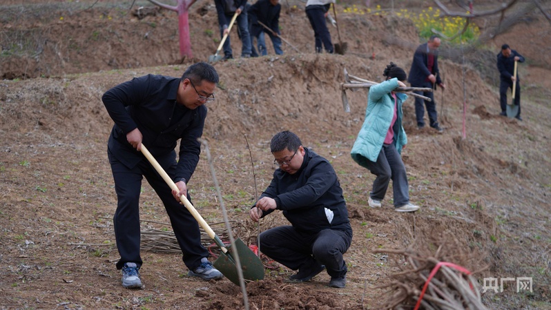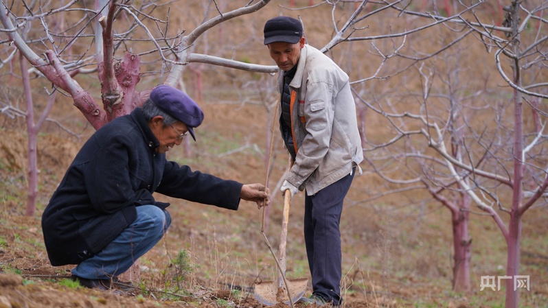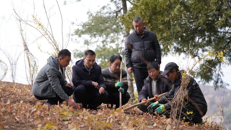 群众在核桃林下栽植连翘(央广网发 刘建军 摄)