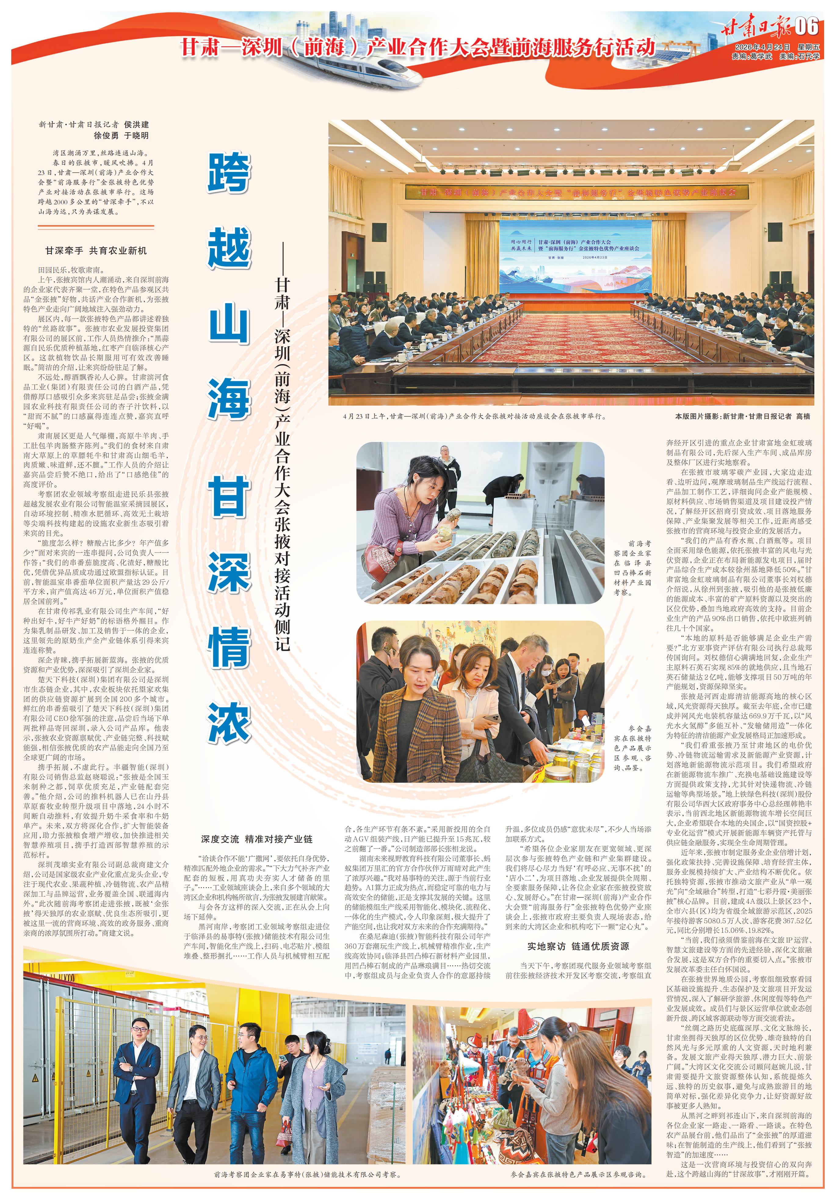 从黑河之畔到祁连山下,来自深圳前海的各位企业家一路走、一路看、一路谈。在特色农产品展台前,他们品出了“金张掖”的厚道滋味;在智能制造的生产线上,他们看到了“张掖智造”的加速度……
