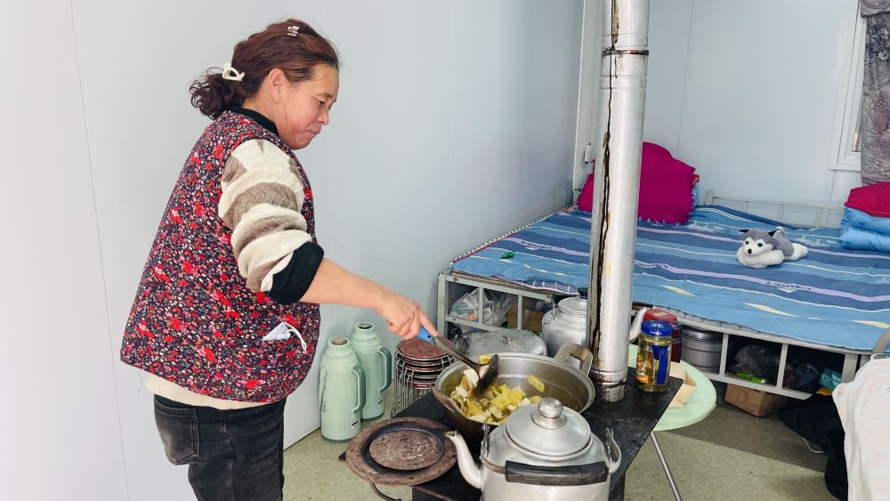 走进刘集乡团结村安置点崔明英房间,香气四溢,她正拿着锅铲翻炒土豆、肉片、青椒等食材,炉上米饭也已蒸熟。她边做饭,边指着旁边冰箱、桌子、板凳说,自己26日住进安置板房,屋里每件物品背后都有乡亲的帮助。