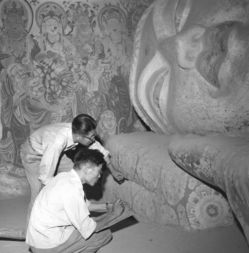 1959年,时任敦煌文物研究所所长常书鸿(左)指导工作人员进行彩绘图案临摹。 新华社记者郝常耕摄