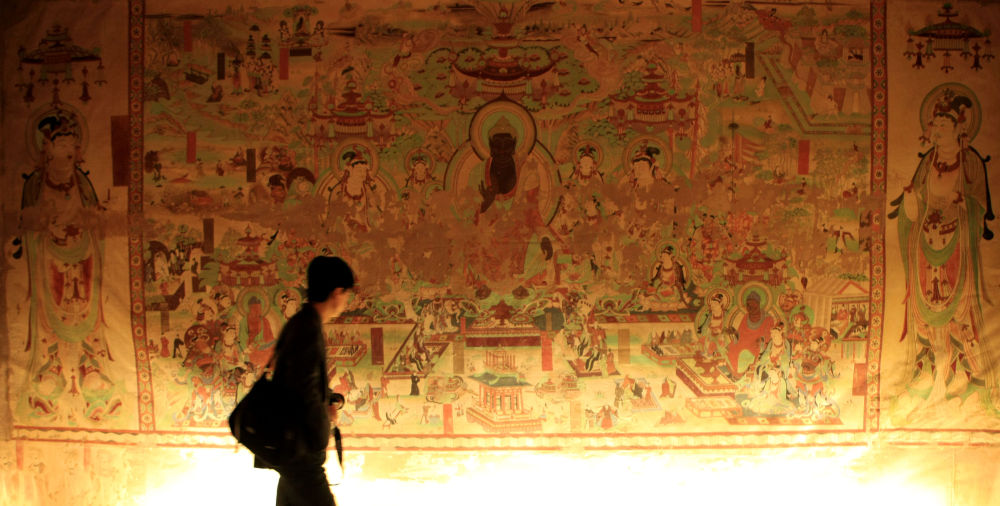 2008年11月18日,参观者在法国巴黎的中国文化中心观看立体复制的敦煌榆林窟第25号石窟。新华社记者 张玉薇 摄
