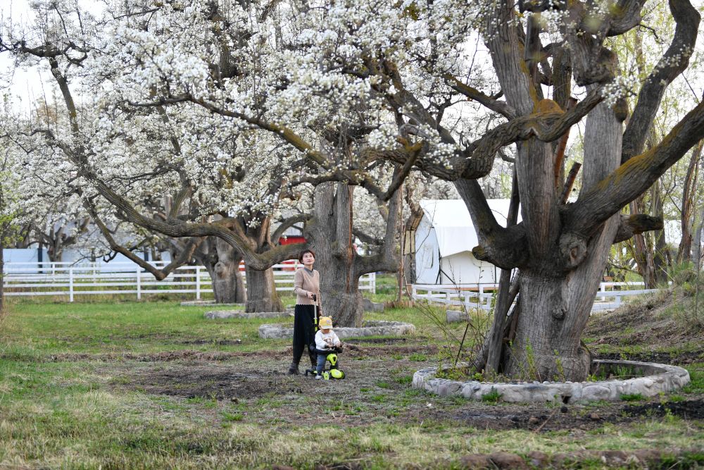 近日,位于甘肃省兰州市皋兰县什川镇的百年梨园内近万棵古树进入盛花期,满树繁花竞相绽放吐露芬芳,吸引众多游客前来踏青赏花。(新华社记者 郎兵兵 摄)