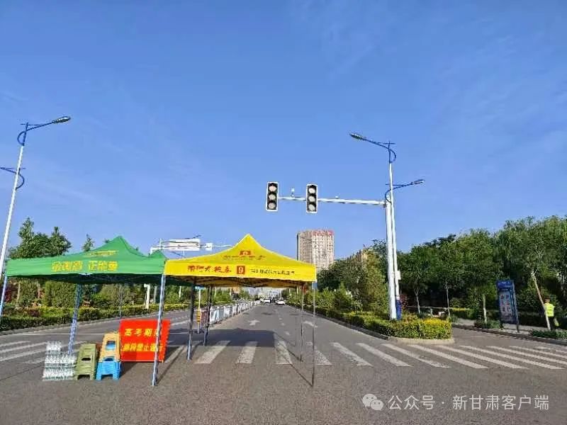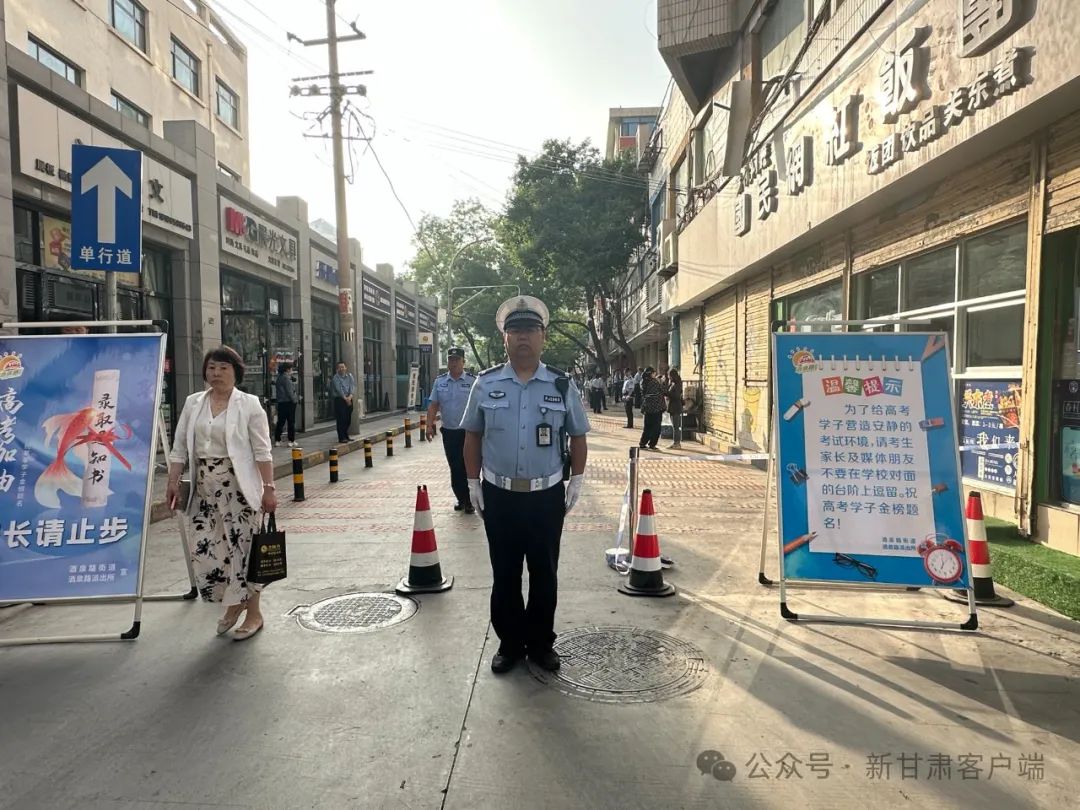 高考首日,早上7:40,张掖市公安局交警支队对考点张掖中学各路口进行全封闭交通管制,并在校门周边设置禁止鸣号、减速慢行、反光锥桶交通标志牌。