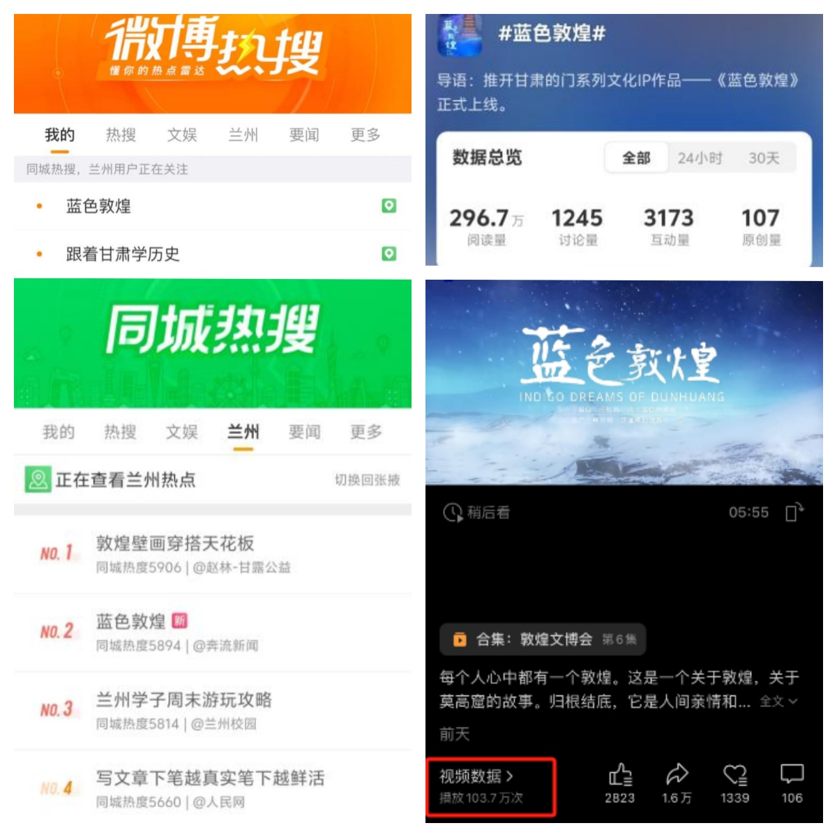 短短四天,全网累计阅读量达1000万。其中奔流新闻客户端阅读量190万+;奔流新闻微博开设话题#蓝色敦煌#累计阅读量290万+,播放当天就冲上微博同城热榜第二位,随后登上总榜前列;奔流新闻视频号发布的《蓝色敦煌》及四条切片视频累计阅读量107万,并得到新甘肃、每日甘肃网、甘肃法治报、甘肃发布、甘肃省博物馆、甘肃省图书馆等甘肃媒体与机构账号,以及人民日报客户端新媒体聚合平台“人民号”、大象新闻、新黄河、重庆第1眼、陕西日报等国内主流媒体支持转发,累计传播量达到360万+。