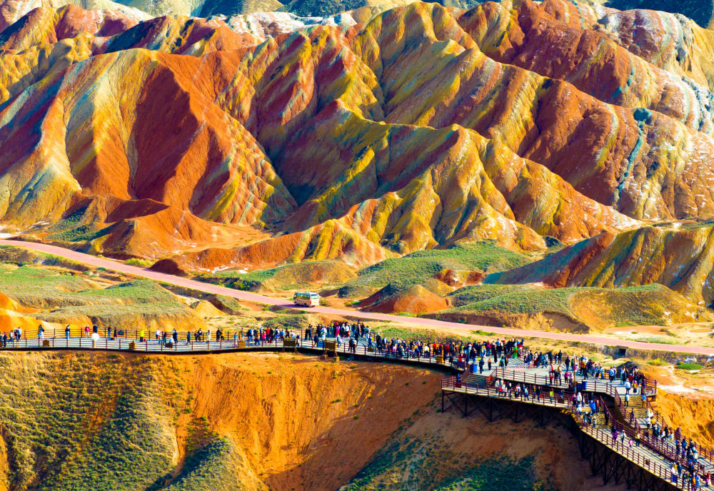 入秋以来,甘肃省张掖市临泽县七彩丹霞景区迎来游客高峰。丹霞地貌色彩艳丽、造型奇特,使游客仿佛置身画境,令人流连忘返。