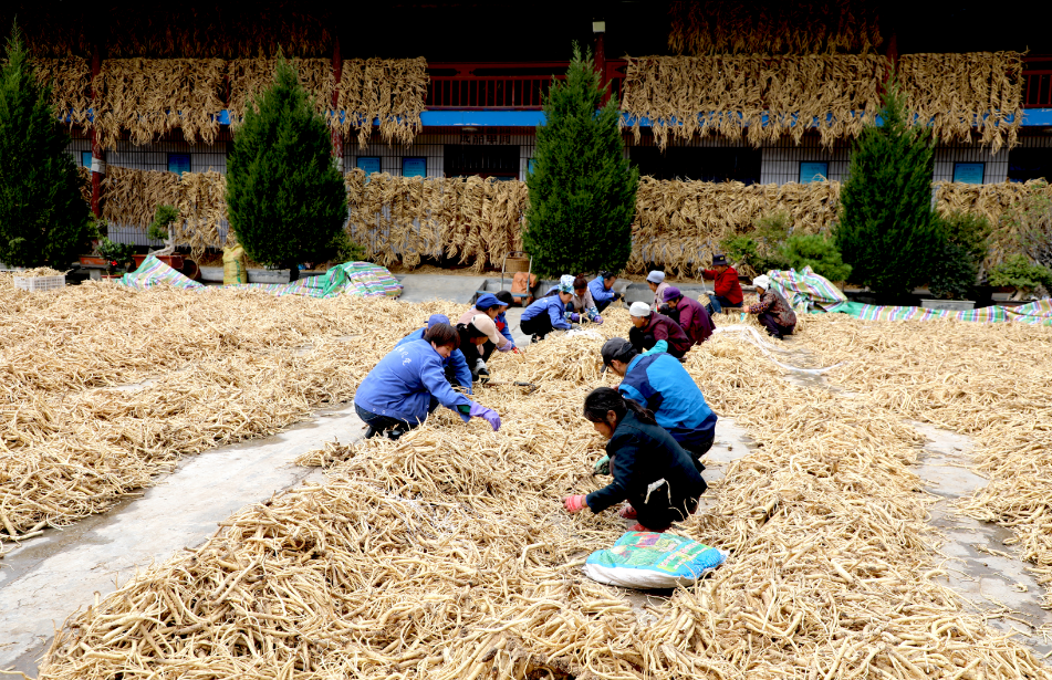 忙碌的种植户们带着丰收的期盼,或是在大山深处一锄一锄挖掘纹党参;或是在加工场地精心分拣、冲洗,搬运、晾晒、切片、打包纹党参......一道道工序有条不紊。