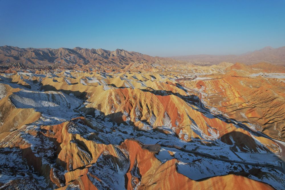 云破日出,积雪渐融,五彩斑斓的“天然颜料”便开始流淌在广袤大地的褶皱里。沿山径栈道徐行,极目远眺,苍茫辽阔间,但见半山素裹半山霓。各色岩层或如烈焰初燃,或似水墨晕染,蜿蜒的纹理、浓烈的色泽,在残雪映衬下愈显饱满艳丽。