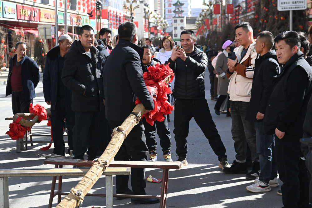 新华社兰州2月12日电(记者范培珅、程楠)农历正月元宵节前夕,63岁的临潭老人马宝瑞换上干净衣裳,特地走上街头,来看大伙儿布置拔河用的钢绳。