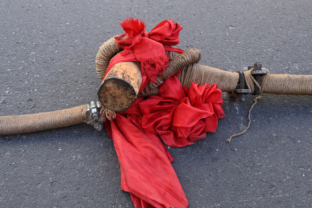 “你看,这个桦木杠就像是‘二龙戏珠’中的珠子。比赛前,用木杠将两侧的钢绳合二为一,这样比赛就可以开始了。”木杠制作人之一、49岁的当地群众宁世雄说,别看这个木杠不起眼,它可需要提前用油炸来增强柔韧度。