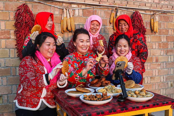 面对镜头,妇女们毫不露怯。油果果、油饼、荞面圈圈一个个沾满油香,依次端上了饭桌。红头巾、大棉袄、花围裙,配上一锅油炸面食,一时间吸引了不少观众上线。